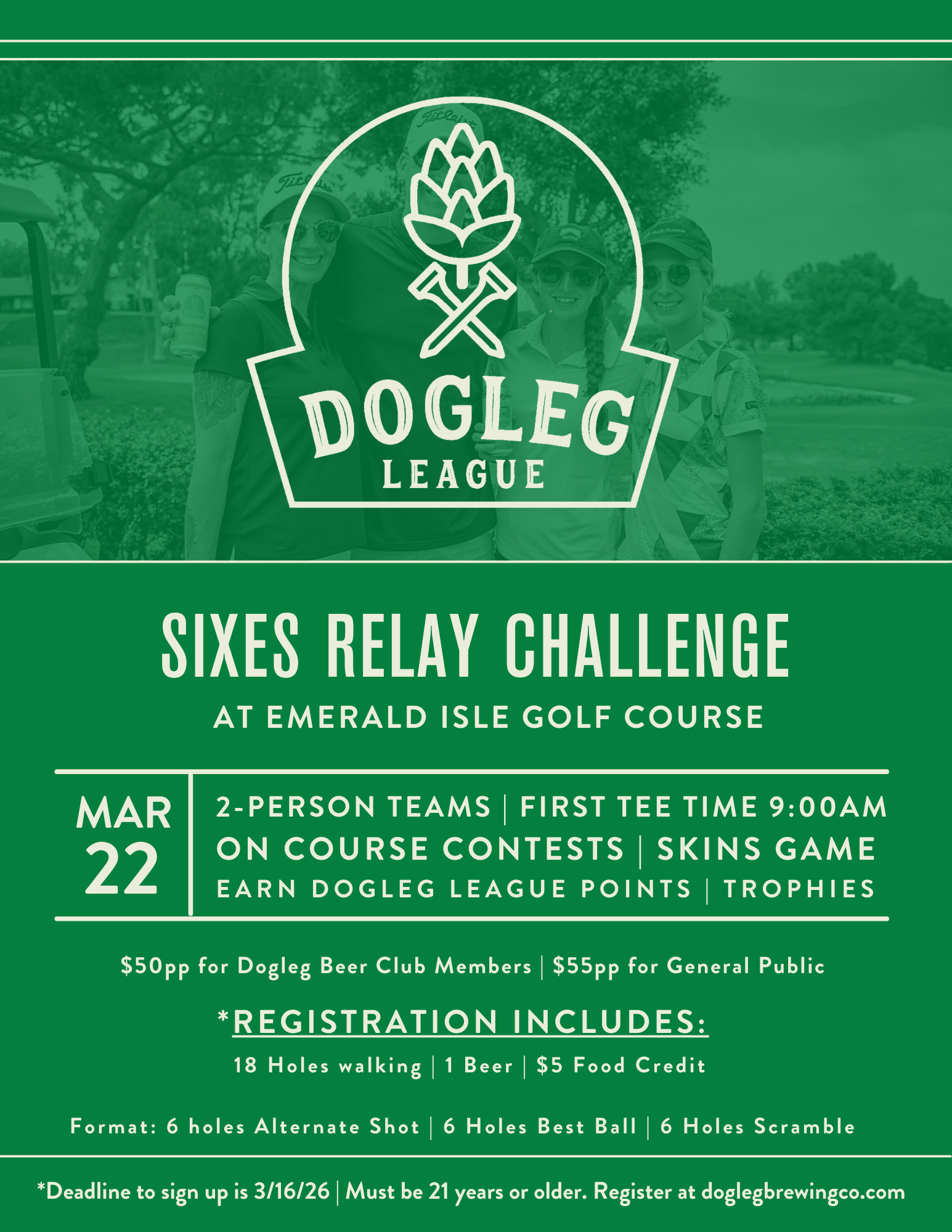 Join us on the links Sunday, March 22, at Emerald Isle Golf Course for this fun relay format! This tournament is a tee time start and the first tee time is 9am. REGISTRATION INCLUDES: 18 Holes walking | 1 Dogleg Beer | $5 Food Credit Format: 6 holes Alternate Shot | 6 Holes Best Ball | 6 Holes Scramble