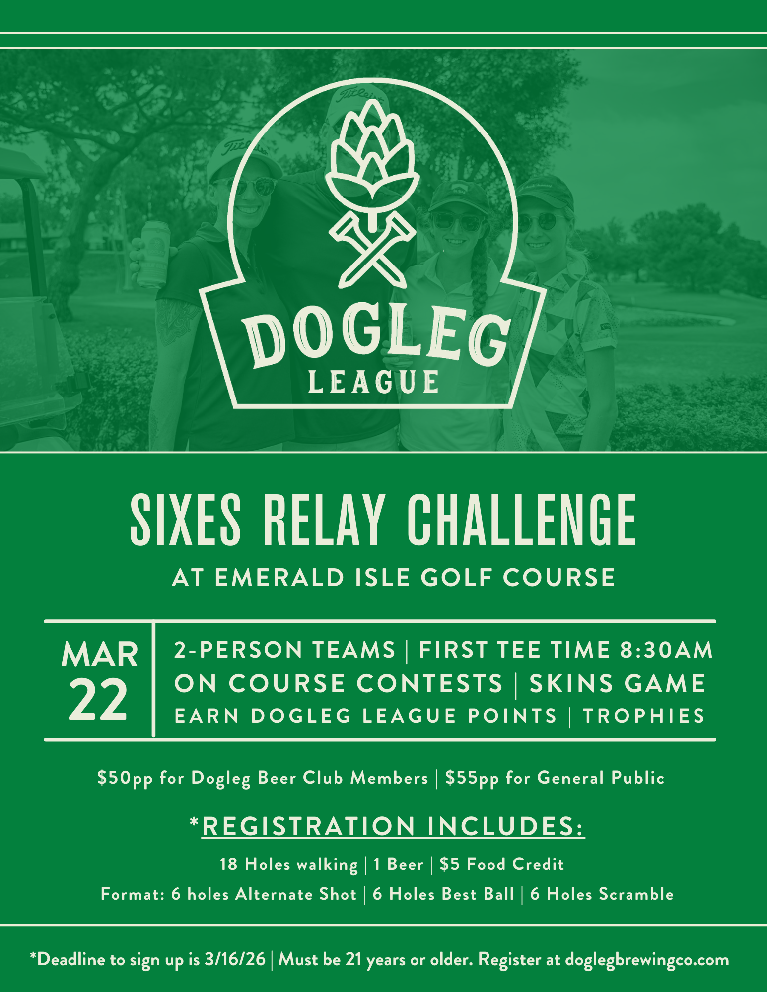 Join us on the links Sunday, March 22, at Emerald Isle Golf Course for this fun relay format! This tournament is a tee time start and the first tee time is 8:30am. REGISTRATION INCLUDES: 18 Holes walking | 1 Dogleg Beer | $5 Food Credit Format: 6 holes Alternate Shot | 6 Holes Best Ball | 6 Holes Scramble