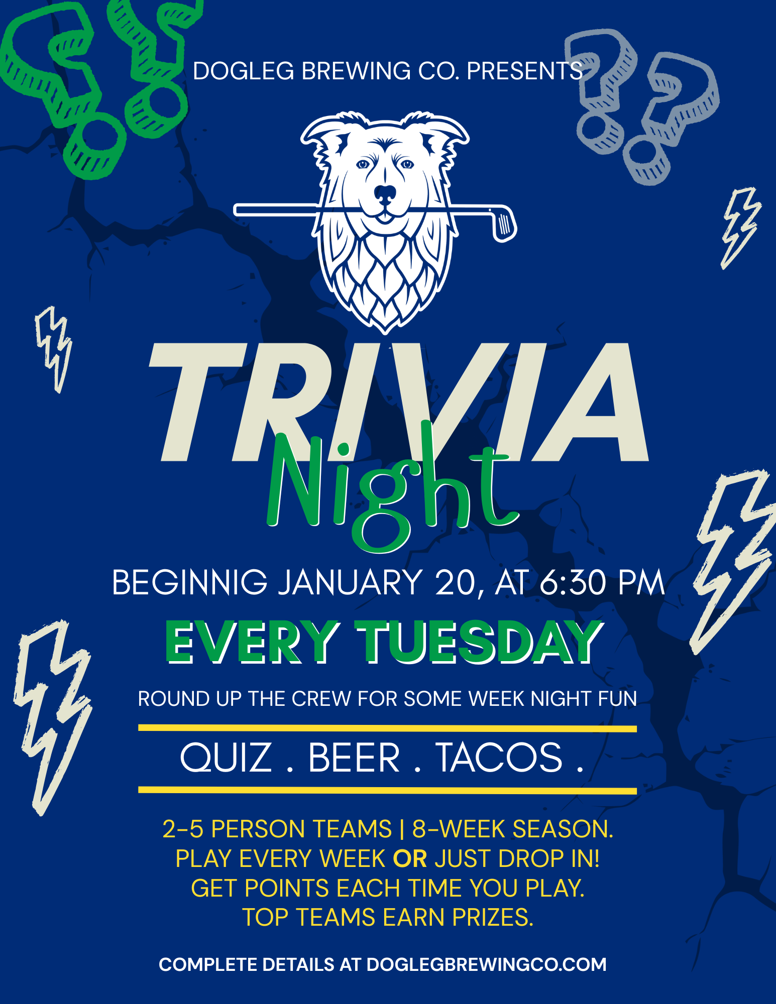 Round up the crew for beer and tacos and join us for some mind-melding fun! Get points each time you play - drop in once, or play each week. Top teams will get prizes at the finale of our 8-week season on March 10. No skills required - just bring your brain full of random factoids and get ready for a good time.